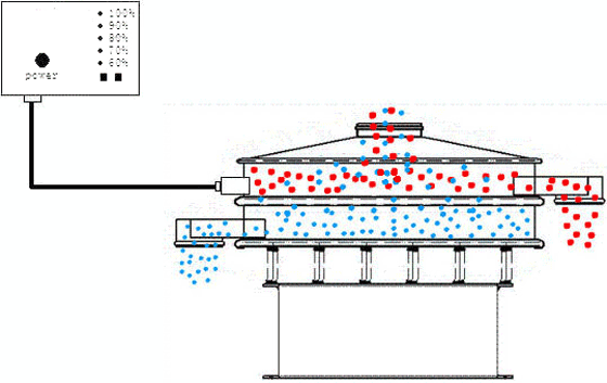 由直立式電機作激振源,電機上、下兩端安裝有偏心重錘,將電機的旋轉運動轉變為水平、垂直、傾斜的三次元運動,再把這個運動傳遞至地面。調節上、下兩端的相位角,可以改變物料在篩面上的運動軌跡。