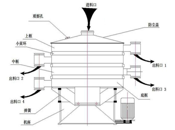 圓震動(dòng)篩起動(dòng)后,其動(dòng)力裝置即振動(dòng)電機(jī)上下兩端不同相位的偏心塊、由于高速放置作用而產(chǎn)生一復(fù)合慣性力,該慣性力強(qiáng)迫篩機(jī)振動(dòng)體作復(fù)旋運(yùn)動(dòng),篩框在振動(dòng)力的作用下連續(xù)作往復(fù)運(yùn)動(dòng),進(jìn)地而帶動(dòng)篩面作周期性振動(dòng),從而使篩面上的物料隨篩箱一同作定向踴躍式運(yùn)動(dòng),其間,小于篩面孔徑的物料通過(guò)篩孔落到下層,成為篩下物,大于篩面孔徑的物料經(jīng)連續(xù)跳躍運(yùn)動(dòng)后從排料口排出,完成篩分工作。