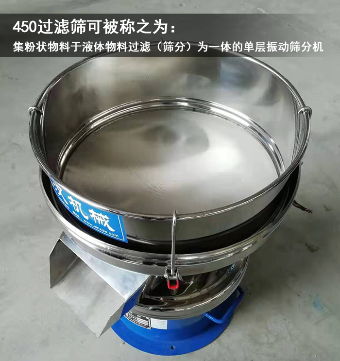 要問450過濾篩還在那里,其450過濾篩過濾篩又叫過濾篩分機,所以它還具有篩分的作用,從結(jié)構(gòu)名稱可以得出其還可以篩分粉狀物料,所以450過濾篩可被稱之為:集粉狀物料于液體物料過濾(篩分)為一體的單層振動篩分機。這也就是過濾篩相對于其它振動篩分機的大優(yōu)勢于特點。