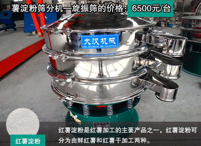 紅薯淀粉是紅薯加工的主要產(chǎn)品之一,紅薯淀粉可分為由鮮紅薯和紅薯干加工兩種。紅薯淀粉其還有減肥的作用,那么紅薯淀粉篩分機(jī)—旋振篩的價(jià)格是多少呢?小編為你提供做真實(shí)的答案薯淀粉篩分機(jī)—旋振篩的價(jià)格:6500元/臺(tái)